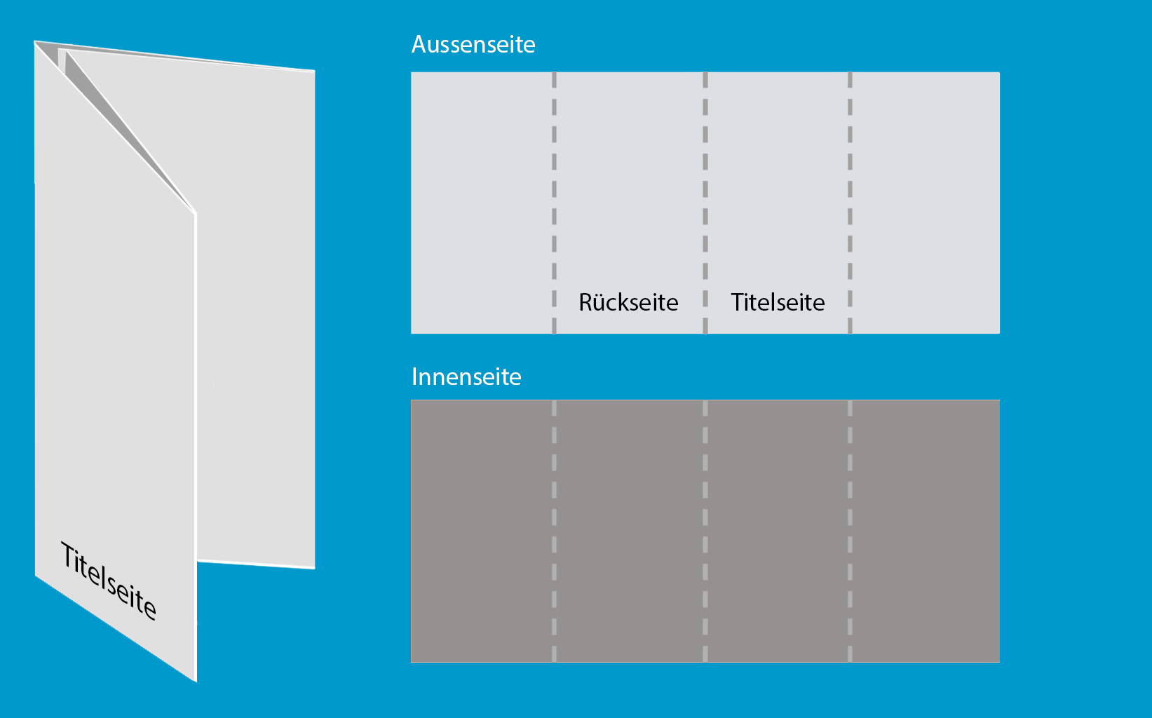 Der Papierbogen wird drei Mal parallel gefalzt: Zuerst werden die beiden äußeren Flügel zur Mittellinie hin gefalzt, anschließend wird der Papierbogen noch einmal mittig gefalzt, d. h. halbiert. Dabei entstehen drei Brüche bzw. acht Seiten:
